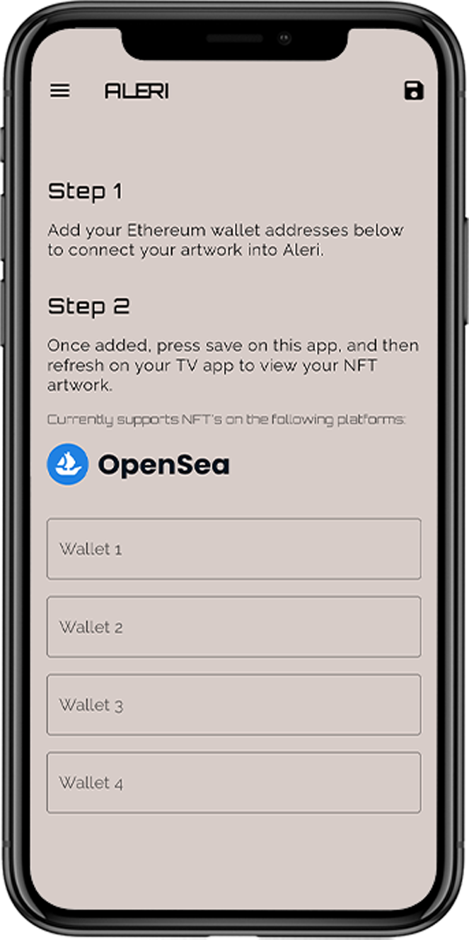 The wallet connector app allows you to copy and paste your wallet addresses straight into the Aleri platform, which can then load the NFT artwork and enable them to be viewed through the Smart TV app.